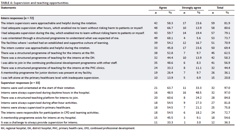 Table 4 reports on supervision during the rotation and the proportion of respondents who agreed with the various statements. Although most interns had adequate supervision during the day (79.1%) and after hours (80.6%), approximately one in five interns felt it was insufficient. Many supervisors (36.3%) also reported struggling with providing adequate supervision, particularly in the PHC facilities. Supervisors believed that interns were well-orientated at the beginning of the rotations (97.0%), while only 73.7% of interns agreed with them. Many interns reported that there was no structured teaching programme at the DHs (41.7%) or PHC facilities (55.6%). Supervisors were more likely to report a structured teaching programme (84.8%).