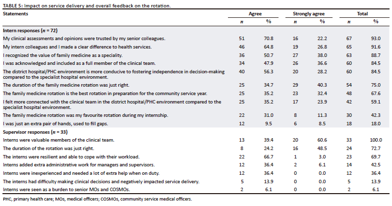 Most interns (75.0%, n = 54/72) and supervisors (72.7%, n = 24/33) felt the rotation was the right length, with some interns feeling it was too long (19.4%, n = 14/72) and some supervisors feeling it was too short (21.2%, n = 7/33). Most interns reported that the rotation helped them recognise the speciality of family medicine (88.7%), and two-thirds (67.6%) thought this rotation was the best to prepare them for community service.