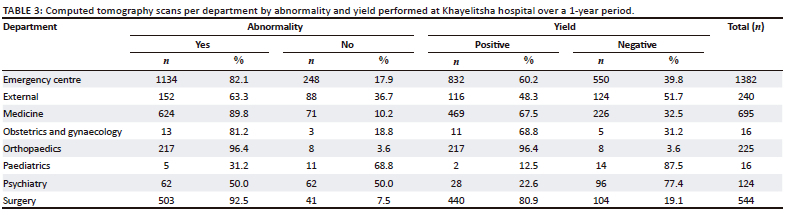 Another notable difference was in the indications for CT, which indicated that only 4.9% of indications were related to trauma, whereas in another South African study, 76% of CT scans were trauma related.6 Although the latter study was performed in a tertiary hospital, the main reason for the low percentage of trauma-related CT scans at Khayelitsha Hospital was because of the policy that was in place. At the time of the study, all trauma patients presenting to Khayelitsha Hospital with an indication for a CT scan were transferred to the local tertiary hospital.