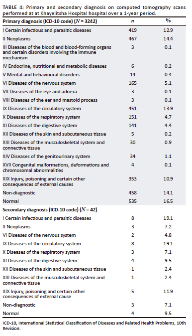 In August 2018, Khayelitsha Hospital became one of the first district-level hospitals in the Western Cape province to have an on-site CT scanner,10 which runs emergency and elective scans during working hours. The utility of a CT scanner at a district-level healthcare facility should theoretically be huge with many potential benefits, but there is limited data available to support this. This study describes the type, clinical indications and diagnostic yield of CT scans performed at a district-level hospital in Cape Town over a 1-year period. In addition, the prevalence of significant abnormal findings and the congruency between the initial clinical impression and the radiological diagnosis on CT were determined.