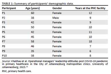 METHODS: A qualitative, descriptive, phenomenological approach was used in this study to explore and describe strategies that can enhance and sustain a positive leadership attitude among operational managers after the COVID-19 pandemic. Ten operational managers were purposively sampled from primary health care (PHC) clinics in different regions of the City of Johannesburg. Data were collected using semi-structured individual interviews. Colaizzi's seven-step descriptive phenomenological analysis method was used to analyse and summarise the data to the point of data saturation