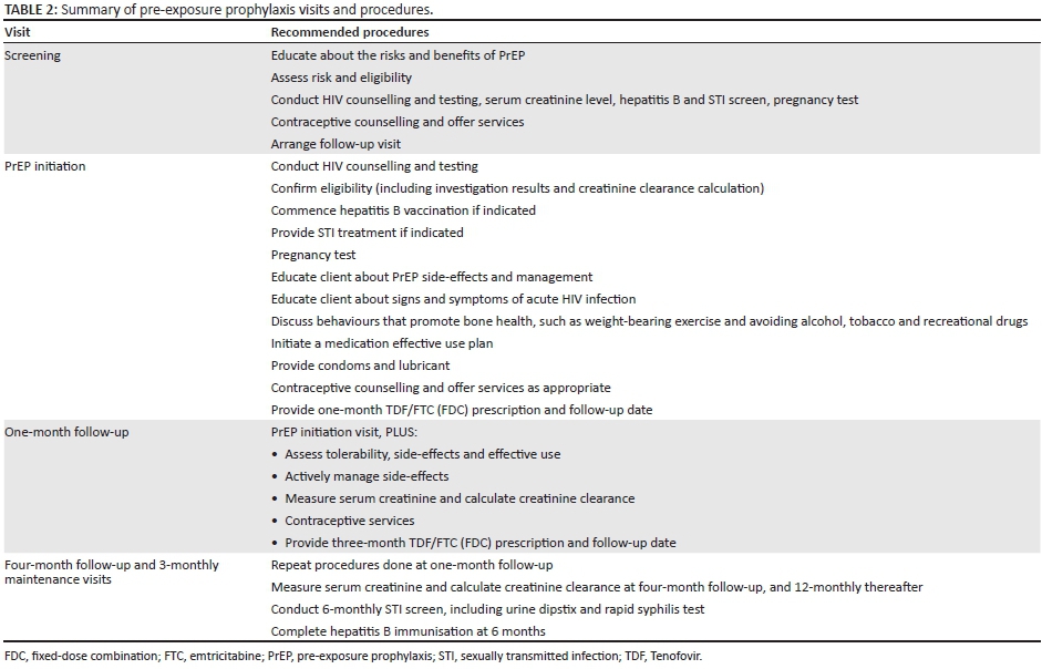 Daily PrEP may be used intermittently during periods of perceived HIV acquisition risk, rather than continually and lifelong, as is the case with ARV treatment. HIV testing, estimation of creatinine clearance, pregnancy screening, and STI and hepatitis B screening are recommended as baseline investigations. Hepatitis B vaccination should be offered to susceptible individuals. Daily oral tenofovir/emtricitabine (TDF/FTC) as FDC, along with effective use support, can then be prescribed for eligible users. PrEP should not be given to those with abnormal renal function, nor should it be commenced in individuals with acute viral symptoms. An initial three-drug post-exposure prophylaxis (PEP) approach may be used whilst confirming HIV-negative status in an individual presenting with acute viral symptoms and a concomitant history of recent potential HIV exposure. An alternative HIV risk reduction method should be used until HIV-negative status is confirmed. Once HIV-negative status is confirmed, switching to PrEP can be discussed. Three-monthly follow-up visits to assess HIV status, pregnancy, tolerance, renal function, adherence and ongoing eligibility is recommended. Six-monthly STI screens and annual creatinine levels to estimate creatinine clearance are also recommended. Hepatitis B vaccination should be provided to susceptible clients. Headache and gastrointestinal symptoms with weight loss are relatively common although usually mild and self-limiting, occurring for the first 4-8 weeks after initiating PrEP. These can be managed with counselling support and provision of symptomatic relief. Although uncommon, ARV resistance is most likely to occur amongst those who initiate PrEP with undiagnosed acute HIV infection. There is ongoing potential for resistance development among those with sub-optimal PrEP use who become HIV-infected while on PrEP. PrEP, if taken correctly and consistently, will offer protection from HIV infection but not from other STIs or pregnancy, and clinicians should continue to support PrEP users to be aware of STI symptoms and other components of combination prevention. Research is ongoing to assess optimum dosing regimens, potential long-term effects and alternative PrEP medications. Recommendations for the use of PrEP among other at-risk individuals, and the components of these recommendations, will be informed by future evidence.