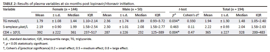 The TG, s-amylase and CD4 counts for 194 out of the sample of 200 patients were statistically analysed, as six patients had to be removed from the original sample because they were already on LPV/r-based regimens for more than six months.