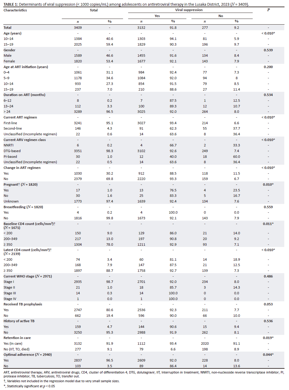METHOD: A retrospective cohort analysis was done of 3409 adolescents on ART at public health facilities in Lusaka from January 2023 to December 2023, and who had viral loads recorded. Socio-demographic, clinical, treatment and behavioural data were extracted from electronic health records and analysed using SPSS version 29.