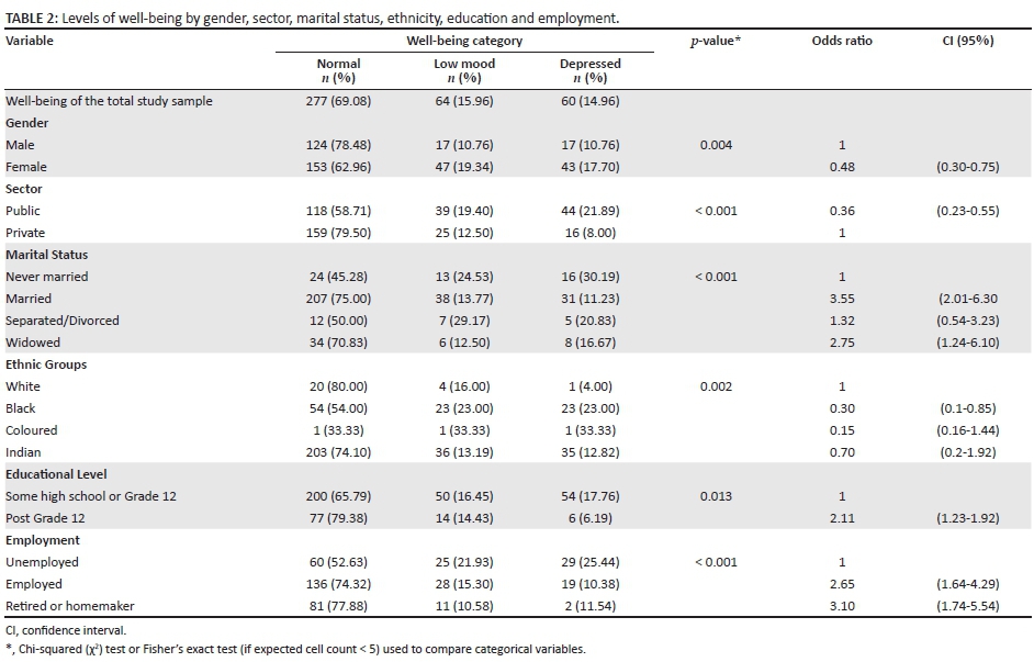 On the WHO-5, 277 (69%) of the sample endorsed good well-being, while 124 (31%) reported poor well-being and were thus considered at risk for depression (see Table 2). More females (43; 17.70%) endorsed poor well-being than males, while 44 (22%) of the public sector sample reported poor well-being. Furthermore, participants who were married (207) had better well-being levels (75%) compared with those who had never married (24; 45.28%). Also, Indian and white groups demonstrated better well-being levels compared to the black African and mixed racial groups. Participants who had a higher educational level (77; 79.38%) or were employed (136; 74.32%) also had better well-being levels.