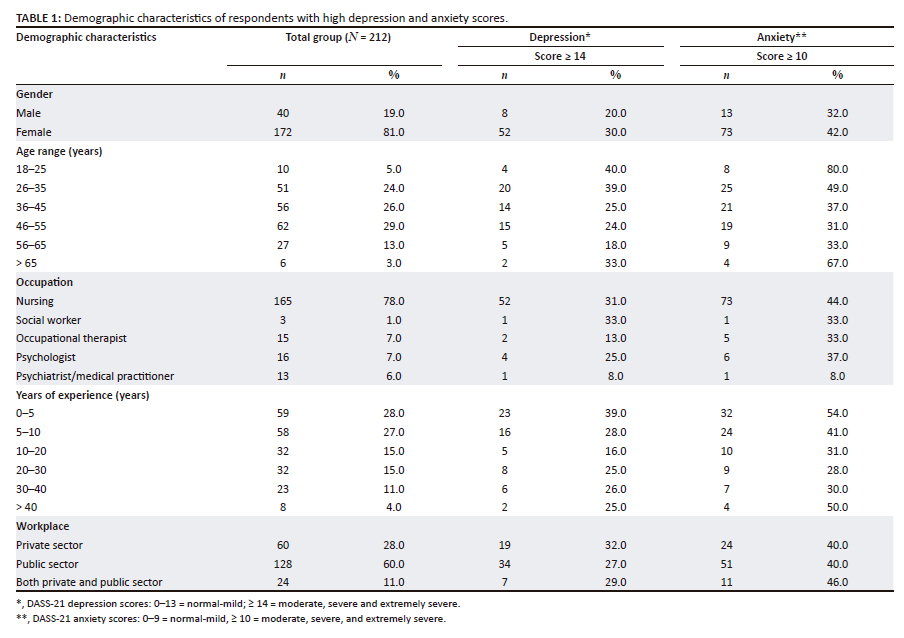A total of 212 (28.6%) of 740 mental healthcare practitioners in Bloemfontein's private and public mental health sectors participated in the study (Table 1). The majority were women (81.1%), nursing staff (77.8%) and between the ages of 46-55 years (29.2%), followed by 36-45 years (26.4%) and 26-35 years (24.1%). Most respondents worked in the public sector (60.4%), followed by the private sector (28.3%), and had between 0 and 5 years (27.8%) or 5-10 years of experience (27.4%).