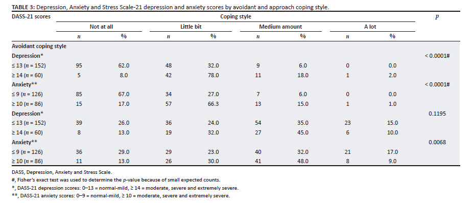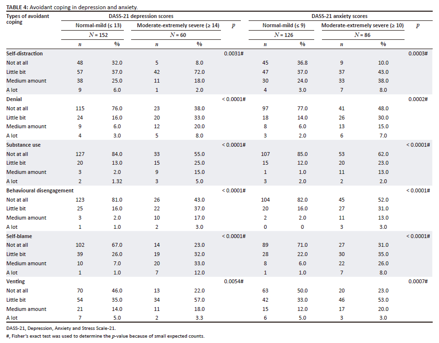 Significant associations between depression, anxiety and all avoidant coping styles were identified in our study population (Table 6). Six avoidant coping strategies were used significantly more by depressed and anxious respondents independently. The associations were particularly robust for self-blame, behavioural disengagement and substance use (p < 0.0001). The other avoidant styles included denial, self-distraction and venting. Respondents with high depression scores used self-distraction (91.7%), self-blame (76.7%), denial (61.6%) and substance use (45%) more often as coping strategies. Most respondents (80.9%) with low depression scores did not disengage behaviourally (p < 0.0001) as a means of coping.