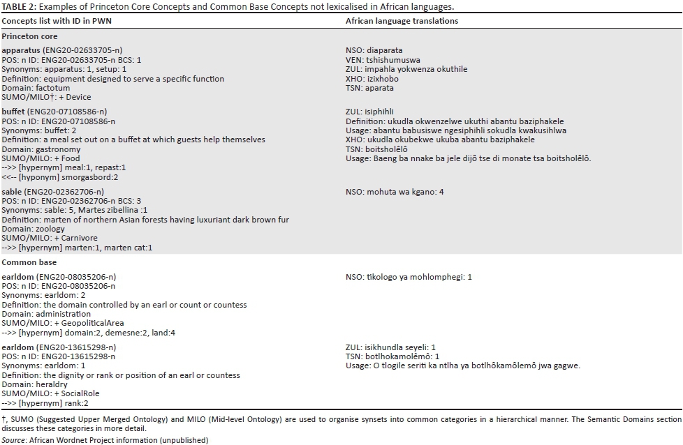 In Table 2, we give some examples of nouns included in the Princeton Core Concepts and Common Base Concepts lists that are not lexicalised in the African languages. From the table, it can be seen that linguists sometimes provided very long descriptions for non-lexicalised terminology, rather than a precise concept. For instance, the translation provided for 'apparatus' in isiZulu literally means 'equipment to make something specific', while the translation of 'buffet' in isiXhosa denotes 'food that is displayed so that people can help themselves'. Lexicalisation challenges are also encountered in the synsets 'earldom' in both the administrative and heraldry domains because these concepts are foreign to the African context.