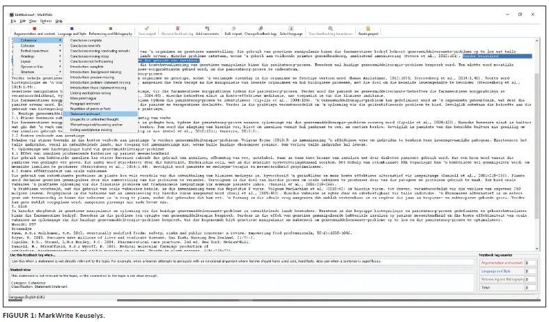 Die annoteerder moet in MarkWrite die stukkie teks waarin die fout voorkom, selekteer en dan eenvoudig na die korrekte keuse in die keuselys navigeer vir die fout om geannoteer te word (sien Figuur 1: 'MarkWrite Keuselys' wat volg).
