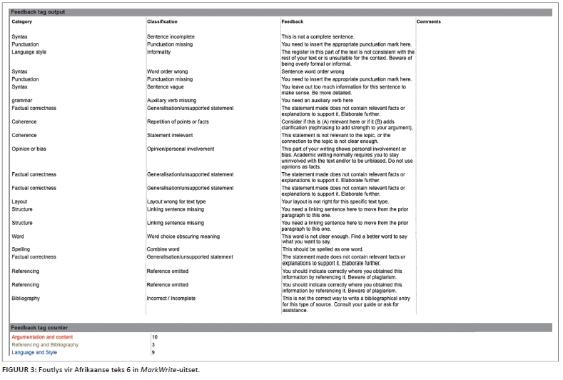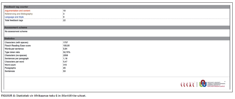 MarkWrite gee vir elke teks 'n opsomming van die annotasies. Hierdie opsomming is die 'Feedback tag output' en 'Feedback tag counter' (Figuur 3 - Foutlys vir Afrikaanse teks 6 in MarkWrite-uitset), asook die statistiek per teks (Figuur 4 - Statistiek vir Afrikaanse teks 6 in MarkWrite-uitset). Beide hierdie figure sluit inligting in van een teks as voorbeeld ter illustrasie. Alle geannoteerde tekste se data is uiteindelik ook in 'n spreitabel versamel, ten einde verdere statistiese analises te vergemaklik.