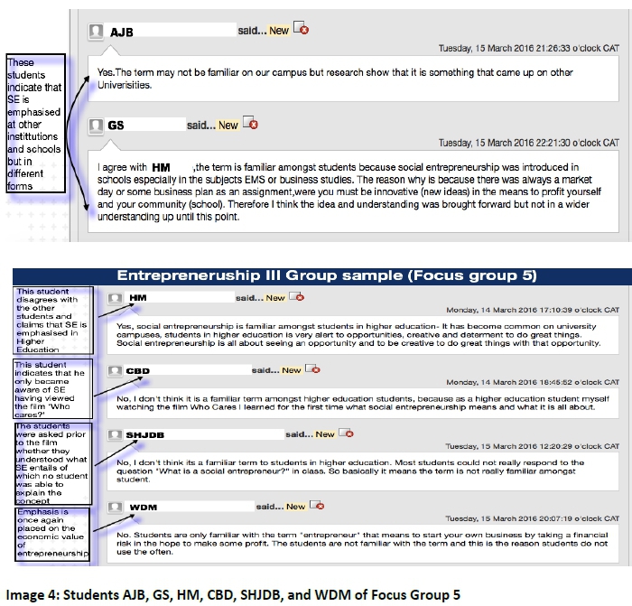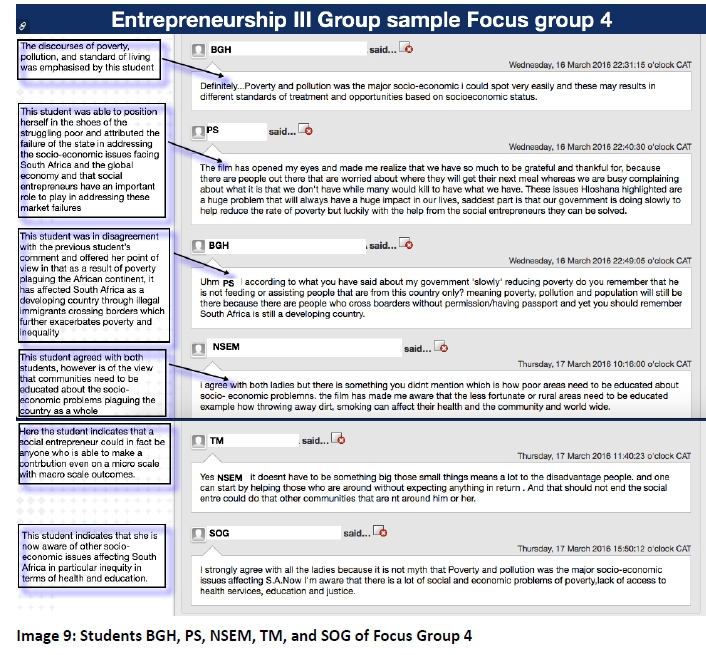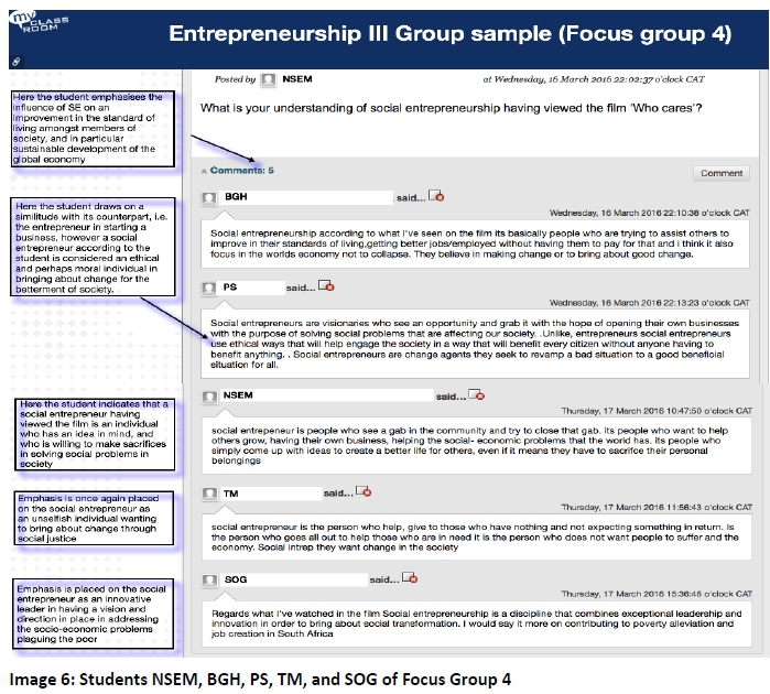 During the analysis of this study's data, the authors used inductive reasoning, which enabled them to clarify meaning and understanding about students' responses to the notion of social entrepreneurship and its application in an educational context. Through inductive reasoning, the authors were able to discover and describe the experiential reality of the case participants within its broader context. To ensure the credibility and trustworthiness of findings, that is, whether the interpretation of the data is a true reflection of the participants' reality, the findings were distributed and discussed with the study participants. In this section, the authors present their interpretation of the key insightful comments that emanated from the online encounters between the students using the Blackboard e-learning platform. Further to this, the section also includes images of the relevant online discussions from which the key insightful comments emanated. Screen shots were constructed from the online discussions on Blackboard and subsequently analysed on a computer graphics application.