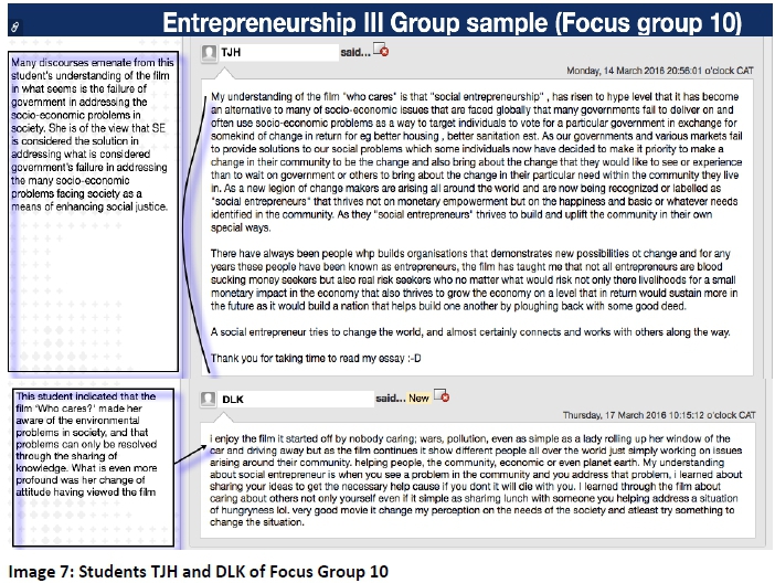 The students were required to complete an online activity on Who Cares? in order to interpret their interactive blogging comments. The film was presented to the students to enhance their critical awareness of the practices of social entrepreneurship and social injustice in society, to elicit a response and, hopefully, to awaken their potential for learning in a deliberative way-that is, learning together. By implication, through the application of film, the authors envisaged that preservice educators' capacities for deliberative learning would be enhanced. In turn, their students' learning about social entrepreneurship education will, hopefully, encourage them to act positively towards the achievement of societal change and justice. Care was taken to ensure that data was collected exclusively from participants who signed and submitted informed consent forms. The participants were informed in class that their participation was voluntary, anonymous, and confidential. Also, ethical clearance was acquired from the faculty's ethics research committee, adhering to the ethical considerations of the study. The written student blogging activities were analysed and categories developed. Online focus group interviews were used to understand the practical activity of social entrepreneurship from the students' perspectives, and to ascertain how and why they reached their opinions. Students' names on the screen shots (Images 1-10) analysed were subsequently replaced with abbreviations to ensure anonymity. As Blackboard is a closed learning platform system, only entrepreneurship education students with usernames and passwords were granted access to the online blogs. The data was subsequently captured, processed, and analysed, and is described in the sections that follow. The following discussion questions were used to guide the students' blogging interaction: