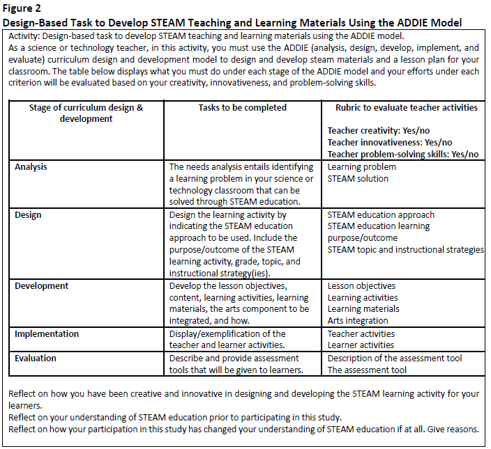 These students' reflections (collected during the interventions, and which indicated limited experiences and familiarity with STEAM activities) were used to develop learning experiences that were used in the second stage of design-based research (Figure 1). The stage entailed the development of solutions, undergirded by conceptual framework based on constructionism through the ADDIE model of curriculum design and STEAM education. This was followed by an evaluation and testing stage (Figure 1) where the students were given the task of designing learning materials that could be used in their science and technology classrooms. The STEAM activity design task given to the students is displayed in Figure 2.