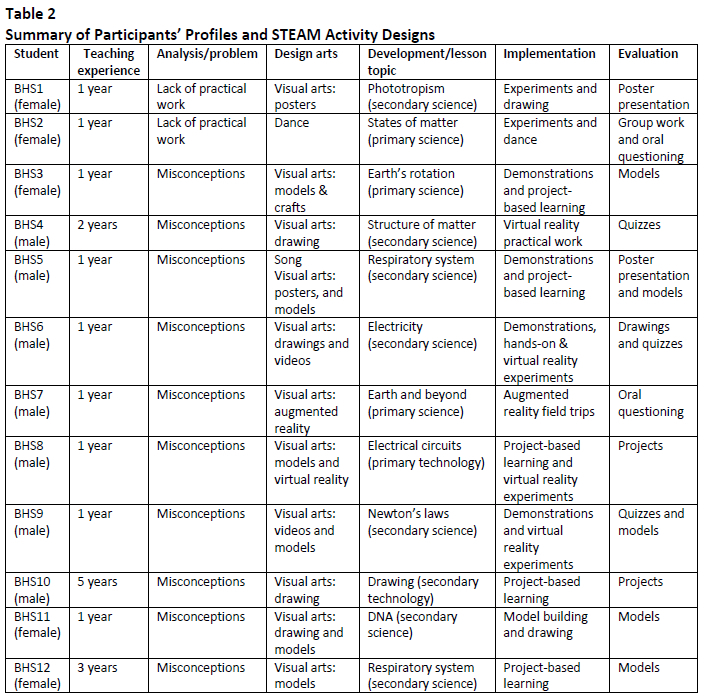 Further, a summary of the participant students' profiles and their STEAM activities designs is displayed in Table 2.