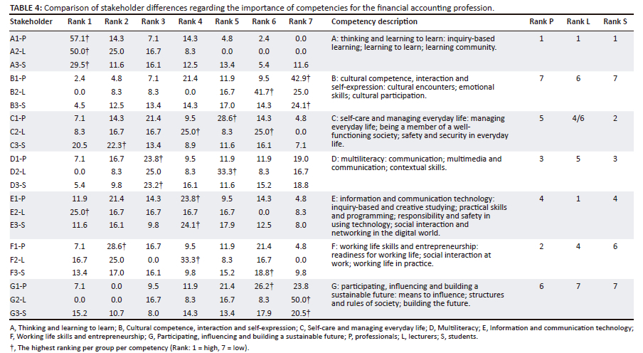 Stakeholders differed in their rankings of 21st-century competencies most relevant for financial accountancy, as displayed in Table 4. There was stakeholder unison for the most important competency A - Thinking and learning to learn (professional = 57.1, lecturer = 50.0, student = 29.5, rank 1). There was also majority agreement for the least relevant two competencies: B - Cultural competence, interaction and self-expression (professional = 42.9, student = 42.1, rank 7; lecturer = 41.7, rank 6) and G - Participating, influencing and building a sustainable future (lecturer = 50.0, student = 20.5, rank 7; professional = 26.2, rank 6). There was also an alignment on two other competencies, D - Multiliteracy D (rank 3) and E - Information and communication technology (rank 4), between professionals and students.