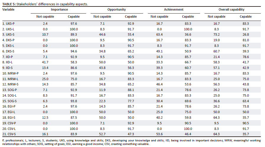 Table 5 shows that the capabilities of financial accounting professionals and lecturers were high, except for involvement in decision-making (41.7%) and earning a good income (50%) for lecturers. All stakeholders strongly valued DKS (professional: 100%, lecturer: 100%, student: 94.6%). Differences became apparent between stakeholders regarding the opportunities available, where both lecturers (91.7%) and professionals (90.5%) indicated strong capabilities, while students' capabilities decreased to 65.2%. Achieving DKS capability remained unchanged for lecturers but decreased further for professionals (83.3%) and students (50.9%). More than 50% of accounting students were not capable on six of the capabilities (use of knowledge and skills [UKS], development of new knowledge and skills [DKS], involvement in important decisions [IID], meaningful working relationships with others [MRW], earning a good income [EGI] and contributing to something valuable [CSV]).
