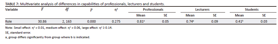 Multivariate analysis of variance is captured in Table 6 and shows a significant effect of the stakeholder group on the combined dependent variable capabilities F(6, 322) = 7.901, p < 0.001.