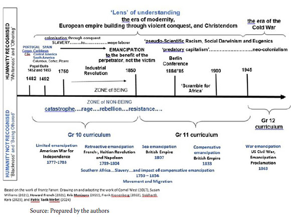 Having briefly taught the topic entitled the 'World in 1450', we begin with the topic referred to as Early Spanish Colonisation but from the perspective of the early evolving of European conquest and enslavement of those categorised as heathen by Christendom, in the year of modernity. The Papal Bulls articulated what has come to be described as the 'Doctrine of Discovery', which provided the theological justification for conquest and slavery. The catastrophe of enslavement for those victims whose humanity was not recognised resulted in rage, resistance, and rebellion. At the forefront of most people's contemporary consciousness is the association of the word catastrophe with the 'nakha in the Palestine mandate of 1947/1948. However, here we refer to a disaster which unfolded over 500 years. We intentionally elevate the voice of rage, resistance, and rebellion to the unfolding catastrophe in the era of modernity and argue that we are teaching and learning from a decolonised perspective. Manjapra (2022) explains that the contradictions which developed in capitalism, confronted by the revolt of those enslaved, resulted in the perpetrators evolving 'emancipation' to their benefit while the victims were negated.