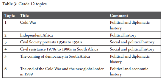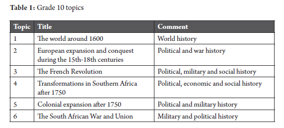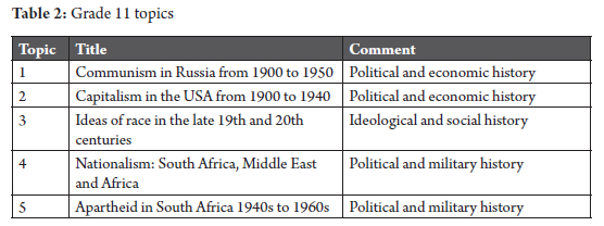 The other three Grade 11 topics focus on power, domination and resistance. One topic focusses on ideas of race, domination and resistance in the nineteenth and twentieth centuries in the USA, Australia, Namibia, South Africa and Germany. A similar theme underlies topics 4 and 5, which deal with nationalism, segregation and resistance in South Africa, the Middle East and Ghana. Arguably, there is minimal socio-environmental history content contained in these topics.