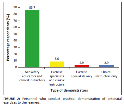 The study determined if antenatal exercises were included in the midwifery curriculum. The result shows that 43 (83.67%) respondents indicated that antenatal exercises were included in the curriculum of midwifery training, while 8 (16.33%) specified there was no content in the midwifery curriculum (Figure 1). The results revealed the personnel responsible for the demonstration of antenatal exercises to the midwifery students as depicted in Figure 2.
