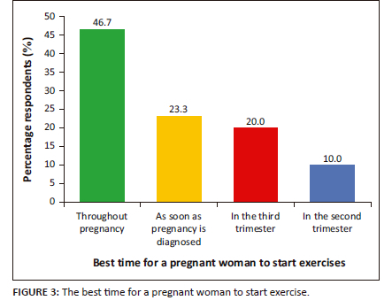Figure 3 depicts the responses on the best time to start exercise during pregnancy. The results also revealed that majority n = 24 (46.7%) of the respondents specified that it is best for the pregnant woman to exercise throughout pregnancy, while n = 12 (23.3%) respondents suggested that antenatal exercise should begin as soon as pregnancy is diagnosed, meanwhile n = 10 (20.0%) respondents indicated that antenatal exercise should begin in the third trimester, and n = 5 (10.0%) respondents specified that pregnant women should start exercise in the second trimester. Respondents also provided information on WHO-recommended guidelines for exercises during pregnancy.