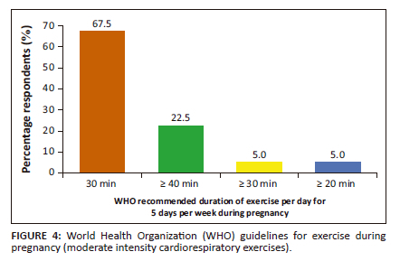 An understood concept that retards the goal to reduce maternal mortality and increase universal access to reproductive health including exercise participation is disrespect and abuse (D&A) during childbirth. Educating healthcare providers and women about their responsibilities and rights will enhance provision and utilisation of quality maternal health services (Amole et al. 2019:21). Scientists recognise that large inter-individual differences in adaptation to pregnancy exist (Forczek & Staszkiewicz 2021:114), and every woman solves this problem on her own. Women react to pregnancy differently; there should be no 'right' moment for every woman to start exercising; rather, the pregnant woman should begin exercise whenever it is safe and comfortable. Santos-Rochas & Szumilewicz (2019:183) suggest that health-related fitness exercise assessments should take into account the body adaptations and the pregnancy-related symptoms of each stage of pregnancy in order to provide safe and effective exercise. The majority of the respondents were reported to be knowledgeable about the WHO recommended guidelines for exercises during pregnancy which states that a pregnant woman should engage in moderate intensity cardiopulmonary exercise training for 30 min/day for 5 days a week, for a total of 150 min/week. The result tallies with the WHO recommendation of moderate-intensity exercise at 30 min/day for 5 days a week, at 150 min per week (WHO 2018:1). The results imply that the respondents teach students the appropriate exercise guidelines during pregnancy. However, the finding is contrary to the report that midwives in Africa, including Nigeria and South Africa, were perceived to lack knowledge on the safety of exercises, weight gain during pregnancy and types of exercises that can be done by the pregnant women. This inadequate knowledge leads to the distrust in midwives and a decrease in a pregnant women's adherence to physical activity (Koeller 2022). Also, research has shown that nurses have a good attitude in promoting antenatal physical exercises in Kakamega county; however, the low knowledge affects their practice of exercise care (Vurigwa et al. 2020:vi). The results are also dissimilar to the findings in the United Kingdom by Hopkinson et al. (2018:25) and Lieferman et al. (2018:168), whose findings in the United States revealed that midwives have deficient knowledge about physical activity guidelines. The results revealed the knowledge of the respondents regarding the ideal exercise for each trimester. In the first trimester, flexing, jogging, lifting dumbbells weighing 1.5 kg to 2 kg, skipping rope, running, rowing, sit-ups/press-ups, squats, the Kegel exercise, swimming and yoga were identified by respondents as the ideal exercises. The result is supported by Huzien (2021:n.p.) who suggested that these exercises are appropriate at low intensity during the first trimester. Paola, Montpeptit-Huynh and Vopni (2019:22) emphasised that squats enhanced strength and stamina of the gluteal and leg muscles. Millard (2021:1) indicated that sit-ups are safe during the first trimester. However, less than 50% of respondents disagreed that pelvic tilts, moderate-intensity dancing and brisk walking are ideal exercises during the early stages of pregnancy. The suggestions that pelvic tilts, moderate-intensity dancing and brisk walking are unsuitable in the first trimester tally with the advice that low-intensity activities are appropriate during the first few weeks of pregnancy until the woman feels more energised (Paola et al. 2019:4). Pelvic tilt exercise is recommended as appropriate from the fourth month of pregnancy, and specifically from the 33rd week (Tian 2018:n.p.). It could be inferred from the differences in opinion about the ideal exercises during the first trimester that midwifery educators do not have adequate knowledge regarding antenatal exercises. The inadequate knowledge of midwifery educators is supported by Hopkinson et al. (2018:25) and Lieferman et al. (2018:168), who reported that midwives lack adequate knowledge about suitable exercises during the first trimester. Ideal exercises identified by the respondents as the best forms of exercise for the second trimester include moderate intensity dancing, pelvic tilts, lifting dumbbells, running, stability ball exercises, squatting and yoga. The result is supported by Bellefonds (2019:n.p.), who indicated that moderate-intensity dancing brisk walking and running are exercises pregnant women can engage in during the second trimester. Ninety of respondents specified that moderate intensity dancing is an ideal exercise during the second trimester, which may suggest that this is a frequent exercise among pregnant Nigerian women. The results from a cross sectional study conducted among pregnant women at the University of Calabar Teaching Hospital, Nigeria, support dancing as a common exercise during pregnancy, and majority of the pregnant women engaged in dancing as a form of exercise (Umoe et al. 2020:162). Carey (2020:3) advised that yoga stretches the muscles and reduces pregnancy pains, such as lower back pain, and decreases blood pressure while Tian (2018:n.p.) asserted that the pregnant woman could start engaging in pelvic tilt exercise in the second trimester. Soma-Pillay et al. (2016:92) and Nair (2018:n.p.) suggested that antenatal exercises during the second trimester could increase in intensity as most pregnant women are more energetic having recovered from the effects of hyperemesis. More exercises that are safe to engage in the second trimester were also found in the literature reviewed and include brisk walks, flexing, foot and ankle exercises, doing housework, Kegel's exercises, rowing, squatting, stability ball exercises, climbing stairs and yoga (Holland 2017:1; Sports Medicine Australia 2016:1). Majority of the respondents disagreed that rope skipping was ideal during the second trimester. The result is in harmony with the advi