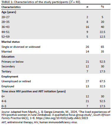 Mpofu, L. & Ganga-Limando, M., 2024, 'The lived experiences of HIV-positive women in rural Zimbabwe: A qualitative focus group study', South African Family Practice 66(1), 1-8. https://doi.org/10.4102/safp.v66i1.5823 [ Links ]