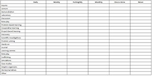 1. The following is a list of classroom methods. Please tick the box that most accurately describes how often you use these methods in your teaching of science topics. Please refer to the addendum, which will clarify what is meant by the instructional methods given below: