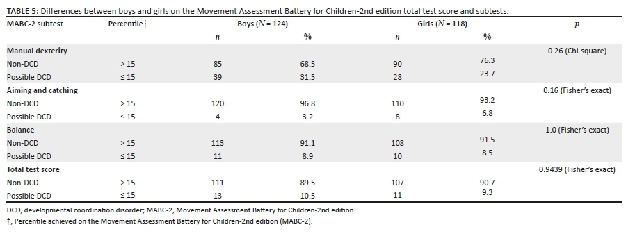 RESULTS: Of the 242 learners, 9.9% were identified with possible DCD. With regard to gender, 10.5% of boys and 9.3% of girls showed signs of possible DCD. No significant difference (p = 0.9439) has been found between boys and girls.