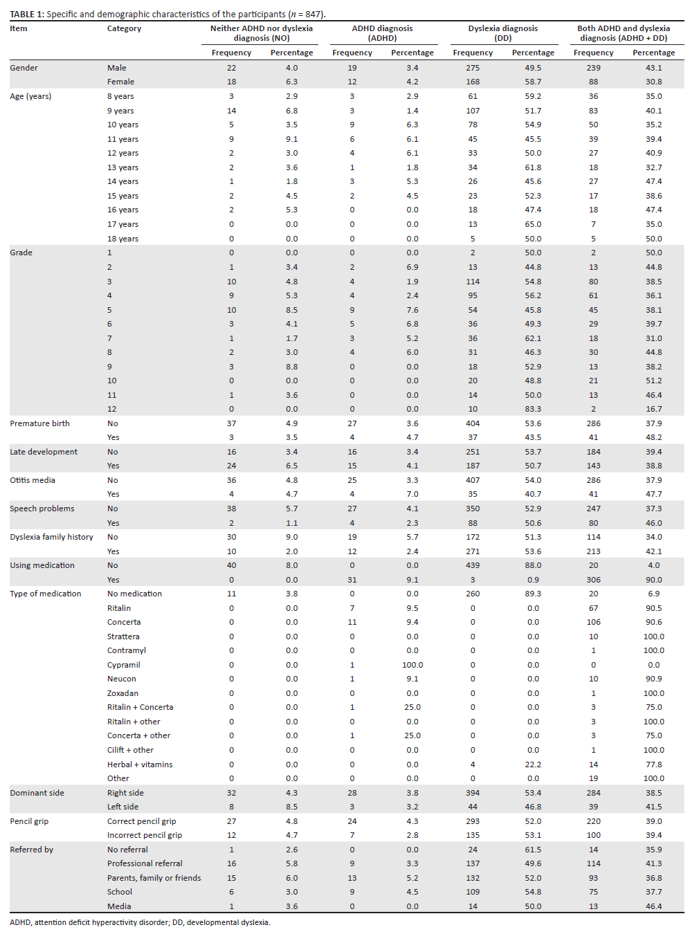 The following characteristics were captured for each participant: gender, chronological age, grade placement, premature birth, late developmental milestones, otitis media, speech problems, family history of DD, reported ADHD diagnosis, ADHD medication, type of ADHD medication, hand dominance, pencil grip, referred by, positive characteristics, negative characteristics, therapy and/or intervention and reported motoric, visual and/or auditory signs and symptoms in schoolwork.