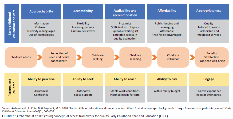 The Levesque Framework (Levesque et al. 2013) is regarded as one of the most comprehensive frameworks in the health sector (Archambault, Côté & Raynault 2020; Cu et al. 2021). It provides five dimensions of access (approachability, acceptability, availability and accommodation, affordability, and appropriateness) and five aligned abilities of individuals and populations (to perceive, to seek, to reach, to pay, and to engage) in healthcare (Levesque et al. 2013). Although it is designed for health systems, the framework equally applies to ECCE programmes. Therefore, it was appropriate for Archambault et al. (2020) to adapt the framework as an integrated approach to understanding the inter-related processes, factors and stages affecting access to quality ECCE, as presented graphically in Figure 1. The five dimensions represent the supply side, that is, the ECCE programmes and institutional environment; whereas the parents' abilities and the social environment represent the demand side. Through these multidimensional insights, the framework may assist an ECCE programme to identify areas of strength and weakness in achieving or attaining inclusive and equitable access.