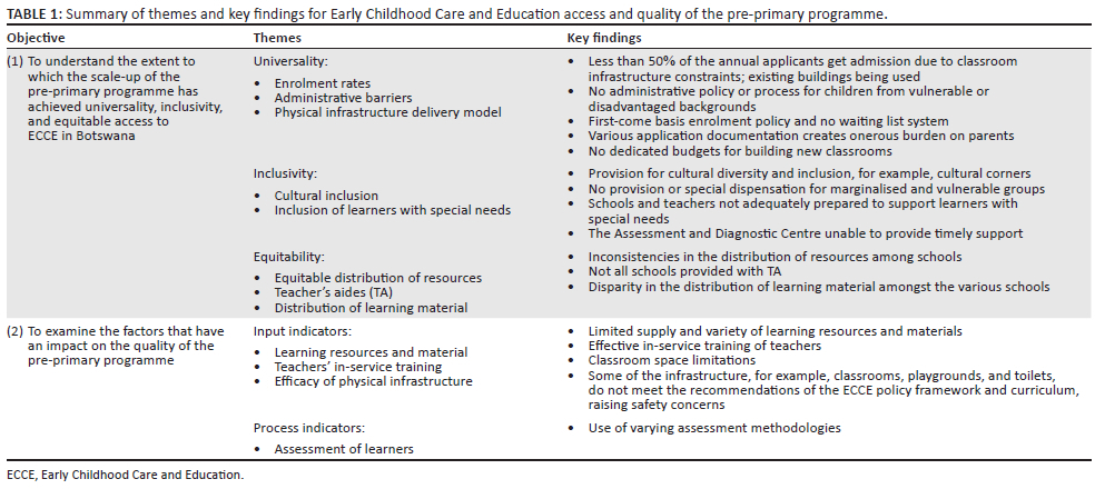 The available research on the pre-primary programme in Botswana focused on the Integrated Early Childhood Development (IECD) curriculum (Bawani & Maphahlele 2021; Mwaipopo 2017). The paucity of studies identifies a research gap on the essential indicators of access and quality of the pre-primary programme in Botswana. Consequently, the aim of this article, based on a qualitative study, is to examine the capacity of Botswana's pre-primary programme to enhance the accessibility and quality of ECCE.