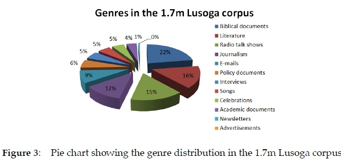 While a quarter of the Lusoga corpus deals with Religion, the inverse also means that three-quarters does not, which is fine given the usual bias in Bantu-language corpora. The topic Networking actually covers such varied items as newspaper texts, mailing-list messages, songs about networking, and even advertisements. The other topic labels are self-explanatory. The data is shown graphically in Figure 4.
