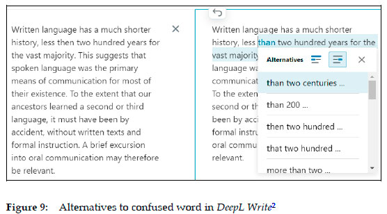 DeepL Write is an example of a writing assistant that gives its users a choice between several alternatives, but which, at least in its beta version, does not support these suggestions with explanations to make the decision easier for the users (see Figure 9). This can cause serious problems. The design used makes it impossible for users to see whether the proposed alternative is a correction of a spelling error or a confused word, or a suggestion to use a better alternative, or simply to vary the language. Users will find that the word they originally typed often appears as number two or three in the list of alternatives. And even if the word is clearly misspelt or confused, they will sometimes also find it further down the list, as in Figure 9. This seems to be an example where artificial intelligence has been given too free a rein, and therefore needs to be further domesticated to become user-friendly. As a minimum, one could have expected DeepL Write to explain to its users what type of problem it had detected and provided alternatives for. This is at least what other writing assistants do, as we will see below.