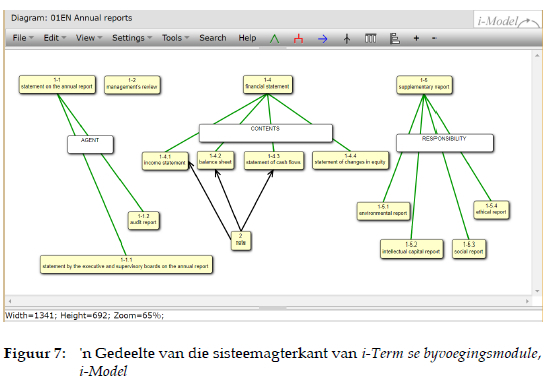 i-Term is internetgebaseerde sagteware wat platformonafhanklik is wat sowel 'n terminologiese as 'n konsepgebaseerde sisteem is. i-Term gebruik 'n byvoe-gingsmodule, i-Model, om sodanige sisteme te bou. Binne i-Modeî kan verskillende tipes relasies geskep word, byvoorbeeld assosiatiewe, deel-geheel-relasies en temporale relasies. Die terminoloog kan addisionele inligting soos kenmerkende eienskappe, onderverdelingskriteria (onderverdelingsdimensies) en notas met betrekking tot die konsepte by die konseptuele sisteme voeg. Gedeeltes van die terminologiese inskrywings se datavelde word outomaties gevul, gebaseer op die inligting van die visuele konseptuele sisteme wat met behulp van i-Modeî geskep is (Madsen 2005: 41, Steurs et al. 2015: 241). Binne 'n terminologiebestuursisteem is so 'n outovoltooifunksie nuttig, aangesien dit tyd en hulp-bronne bespaar om terminologiese inskrywings aan te vul. Kundiges beskou i-Term as ultramodern, gebruikersvriendelik en konsekwent in die skep van konseptuele sisteme (Madsen 2005: 52, Costa et al. 2017: 72). In die onderstaande figuur word die term 'financial statement' binne die relevante konseptuele raamwerk geïllustreer.
