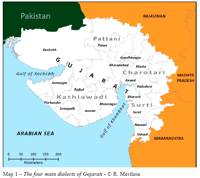 The changes k -> c and kh -> s occur in neither Surti nor Kathiawadi and are best exemplified from Charotari of the central Gujarati speaking area (see Map 1).7