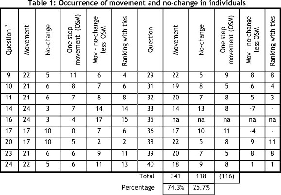 Total movement was counted 341 times and no-change 118 times (Table 1). In our opinion, with a one step in movement, there is doubt whether a shift has taken place or not, and these results are removed from further analysis that considers the significance in difference between movement and no-change. When the one step movements are removed (see Table 1, column five), there are generally more incidences of movement than no-change, but not always. Two out of 17 questions (Table 1) show that no-change occurs more often than movement. Two other questions indicate a small difference between the incidences of movement and no change, of one or two extra occurrences for movement. To test hypothesis (a) that participants will shift their opinions in a strategy process, the difference between movement and no-change (Table 1) is tested for significance. Non-parametric statistics are used - as no distribution is specified - to test the two columns in Table 1.