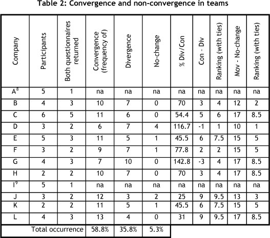 The results in Tables 1 and 2 are not from a random sample, and are based on ten companies. From these companies, 27 paired questionnaires were returned (pre- and post- process questionnaires) and were used for analysis. Overall movement among individuals occurs about 75% of the time, and no-change about 25% of the time. Three conditions were identified: convergence, divergence, and no-change. Overall there is about 60% convergence, 35% divergence, and 5% no-change among the strategy teams.