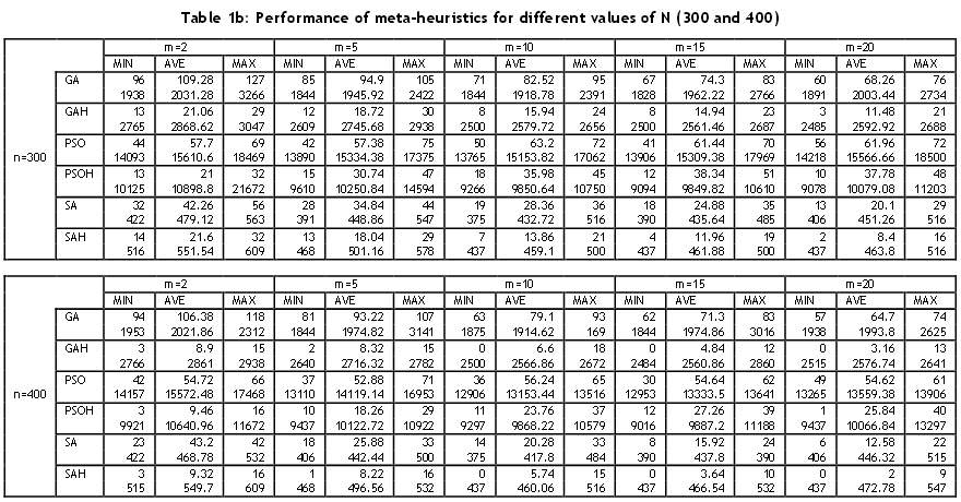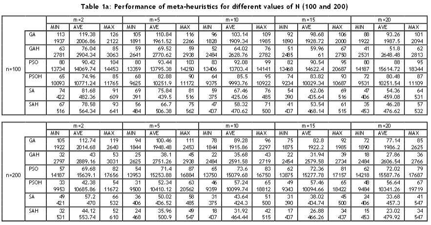 For each combination of n, k1, and k2, ten instances were generated; i.e., for each value of n, 160 instances were generated for 8,000 problems of 50 replications. The metaheuristics were implemented on a Pentium Dual 1.86 GHz, 782 MHz, and 1.99 GB of RAM. The following meta-heuristics were analysed: GA, PSO, SA, GA Hybrid, PSO Hybrid, and SA