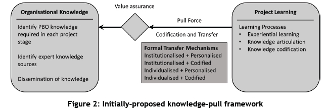 The knowledge-pull framework is a result of the interaction between the project learning and organisational knowledge dimensions. The first consideration is the learning that takes place within the project itself. Depending on organisational factors (receiver characteristics), factors within the project (sender characteristics), and the degree of articulation and aggregation, different knowledge transfer mechanisms are used to transfer the knowledge to the organisation. The framework outlines the processes required by the organisation to ensure that the knowledge can be transferred as part of the project execution workflow and disseminated throughout the organisation.