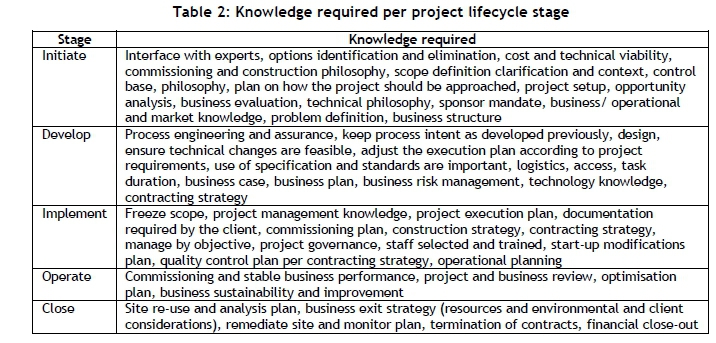 The types of knowledge pertinent to each project stage are outlined in Table 2.