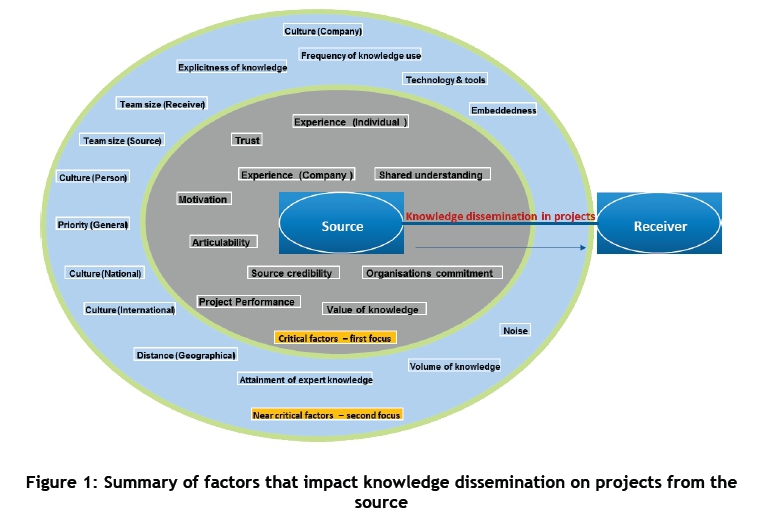 The above figure highlights the flow of knowledge dissemination from the source to the receiver and the associated factors that impact knowledge dissemination in projects. The list of factors in the inner circle (as depicted in Figure 1 above) can be seen as the critical factors, with the remaining factors being the near-critical factors in the outer circle. With no significant difference between the factors, and no priority emerging among the top ten factors (no single factor had a bigger impact than the others), the principle of 'critical path' can be applied to the factors listed, with the main focus being on the critical path - in this case, the critical factors. The near-critical path also enjoys focus, but not as much as the critical path. In this instance, it is the near-critical factor. The near critical-factors cannot be neglected, for they have the potential to become critical factors.