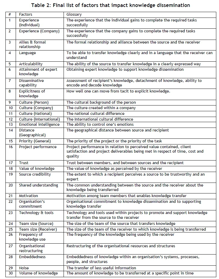Selected interviews were conducted with an expert group to evaluate and short-list the factors that impact knowledge dissemination on projects, to optimise the relevance of the identified factors for application in project environments. The expert group consists of two academics and four experts from industry, with an average project experience of 14 years. Through this expert group, the original list of factors was reduced to 30 factors that are relevant to projects. The final list of factors and the glossary used in this study is given in Table 2.