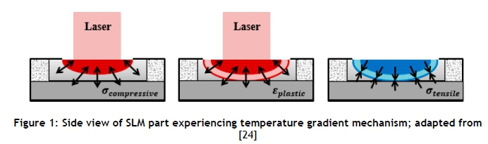 Residual thermal stresses may be induced in a part produced by selective laser melting via the following phenomena: