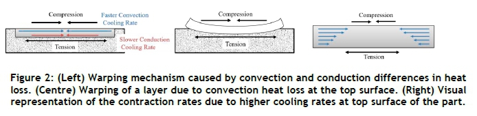 Three main heat transfer mechanisms can be identified during the SLM process [28], [29]: laser radiation, convection, and conduction. The largest heat loss mechanism is through convection at the top surface with the ambient atmosphere of the SLM system [28], [29]. In the third phenomenon, the top surface of the exposed layer experiences a faster cooling rate through convection than the bottom of the layer through conduction. This results in the top surface contracting at a faster rate than the bottom surface, as shown in Figure 2. Subsequently, Type II residual stresses are introduced into the part. The grains at the top surface of the layer experience a cold zone, while the lower grains experience hot zones. The contraction of the cold zone at the top surface causes the hot zone to yield, which in turn results in the part warping upwards in the positive z direction [27], [30], [31].