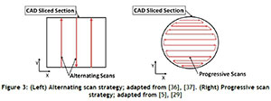 The alternating scan strategy (also referred to as the 'raster scan strategy') alternates the vector direction after each scan [37]. The laser scans one vector from the start point to the end point, and then starts with the next vector. The starting point of the next vector is in close proximity to the end point of the previously scanned vector. The alternating scan strategy is shown on the left in Figure 3 below. Note the different directions of the scan vectors. The progressive scan strategy is similar to the alternating scan strategy, except that the scan vectors are continuous and the laser scanner flows from one vector to the next without any delays or jumps [5], [29]. The strategy is illustrated on the right in Figure 3 below.