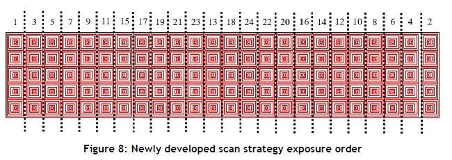 One can observe from the figure that the whole part is broken up into 24 sectors of 25 mm x 5 mm. The sectors are scanned by the laser in numerical order until the entire sector is completely melted before moving over to the next sector. So the laser will scan sector 1 until the entire sector is solidified; the laser will then move to sector 2; and so on. This then allows for distributed heat input into the layer.