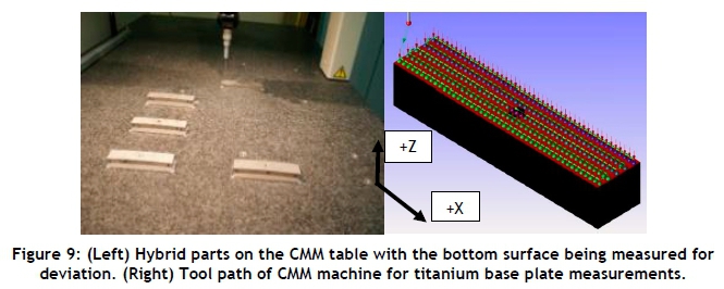 Prior to SLM, the top surface geometry of each hybrid base plate was measured with a Mitutoyo Bright A710 coordinate measuring machine (CMM) to ascertain whether machining induced an error resulting in non-flat initial surfaces. The sampling density required 222 points to be measured; so the CMM tool path was five lines along the length, each with 45 sampling points.