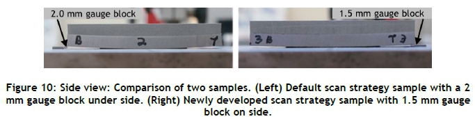 Two samples produced with different scan strategies are presented in Figure 10. It can be noted that the deviation from the default strategy (left side) is larger than that of the new scan strategy (right side). This is initially demonstrated qualitatively by finding the largest gauge block that could fit between the sample and the building plate. For the default strategy, a 2.0 mm thick gauge block fitted, whereas the maximum thickness that would fit underneath the new scan strategy sample was 1.5 mm. This observation was then fully quantified with CMM measurements.