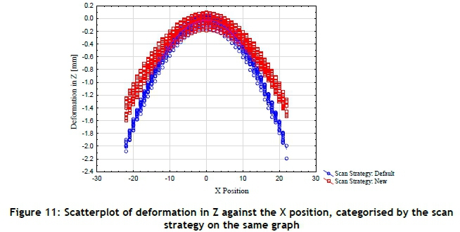 Figure 11 presents a scatterplot of the Z-deformation against the position of measurement in the X-direction (according to Figure 10). Deformation in the Z-direction is represented by the difference between the pre- and post-SLM CMM measurements. The samples warped in a parabolic shape from the fixation point in the centre outward towards the part edges. This observation is in accordance with Figure 2, and the net effect is most prominent on the largest dimension of the part.